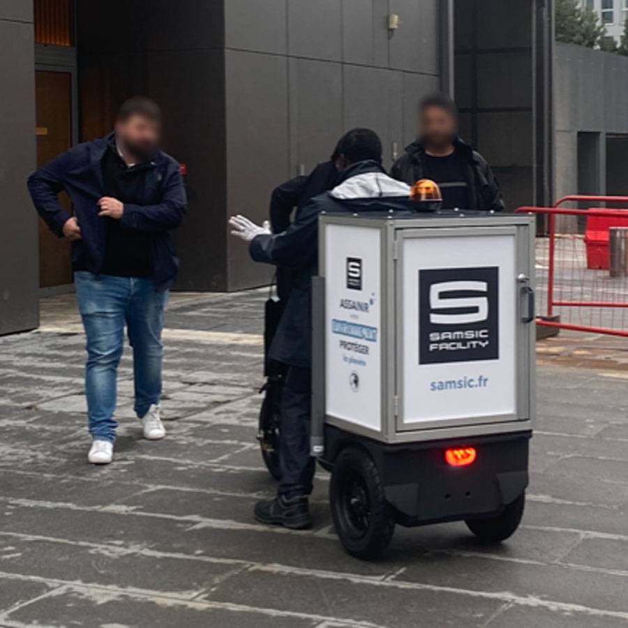 Pour un néon défectueux, une poignée à reprendre ou une micro-panne sur une porte automatique, le triporteur devient poste d’intervention mobile : planche latérale pour poser l’outillage, rangements modulaires pour EPI et consommables, gyrophare pour sécuriser l’arrêt ponctuel en zone technique. Les rampes de parking sont franchies sans à-coups : montée régulière, descente contrôlée.