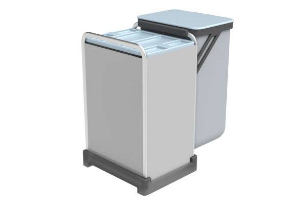 Gestion des déchets : supports métalliques et couvercles de 70 litres pour sacs poubelle, complétés par des crochets robustes.