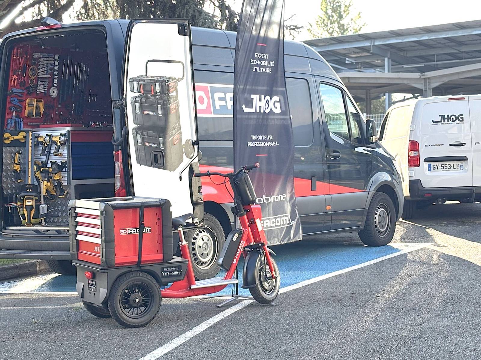 Chaque technicien dispose d’un véhicule utilitaire électrique capable de transporter son matériel, ses coffrets FACOM et ses pièces détachées directement sur le lieu d’intervention.